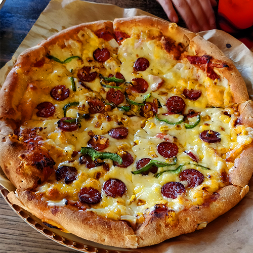 La croûte est généralement très épaisse, il a beaucoup de fromage et quelques pepperoni par dessus. C’est bien bourratif.